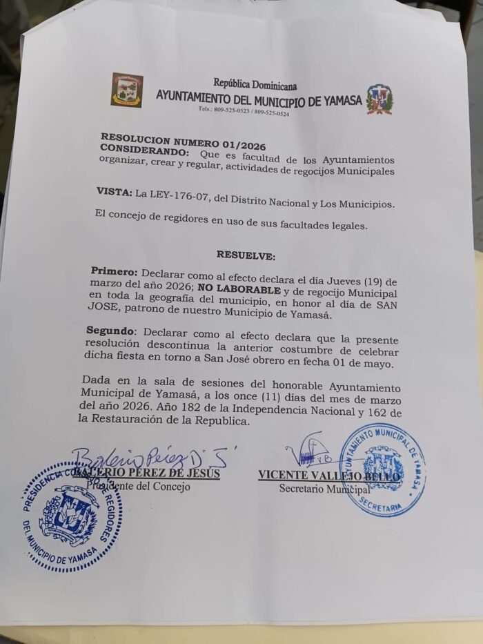 El Concejo de Regidores del Ayuntamiento Municipal de Yamasá informa a toda la población que, mediante la Resolución No. 01/2026, se declara NO LABORABLE el día jueves 19 de marzo del año 2026, en todo el municipio.