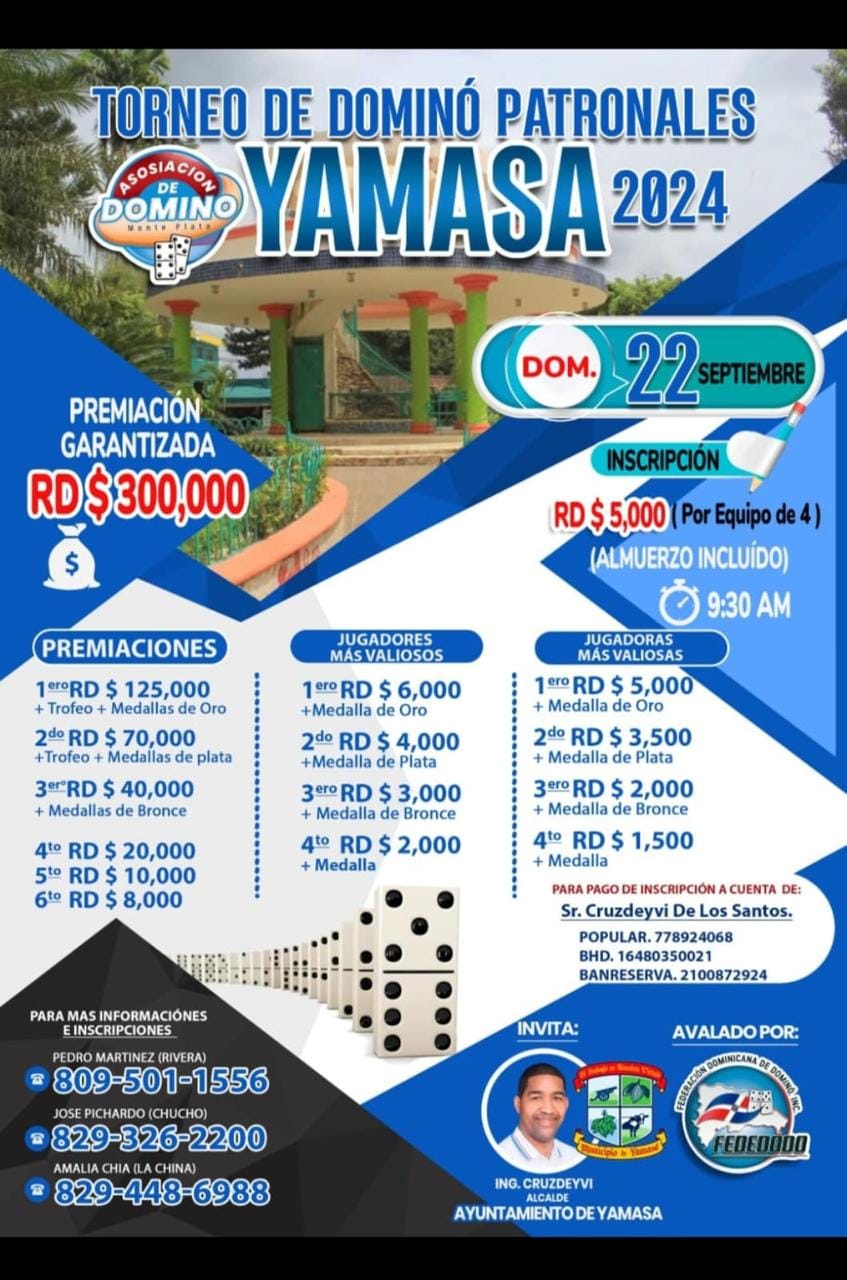 EL AYUNTAMIENTO MUNICIPAL DE YAMASÁ TE INVITA A PARTICIPAR EN EL TORNEO DE DOMINÓ.EN EL MARCO DE NUESTRA FIESTA POPULARES Y CULTURALES.