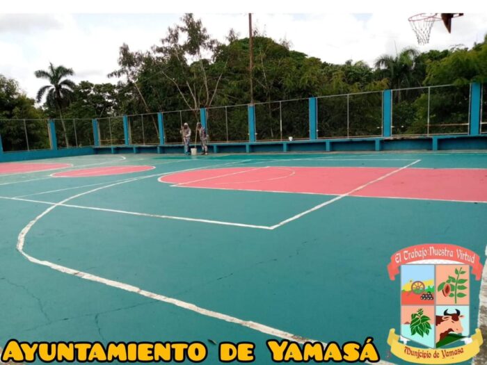 Sin descanso y fuerza de voluntad brigada del ayuntamiento de Yamasá, se encuentran pintando la cancha de la comunidad el mogote.