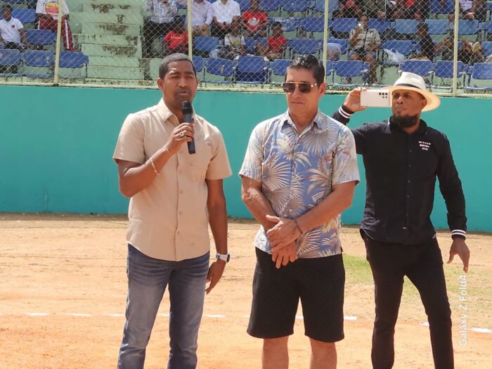 El Alcalde de Yamasá, Ing. Cruzdeyvi De Los Santos, junto al Director de Deportes Provincial, Therry Aquino, y el reconocido lanzador de Grandes Ligas, Fernando Ronny, realizaron el saque de honor en la inauguración del Torneo de Béisbol Viejas Glorias.